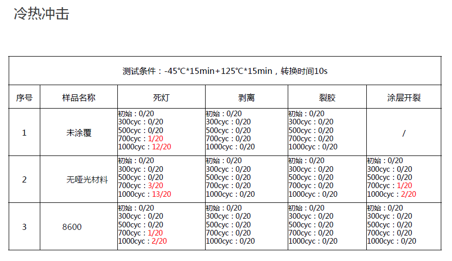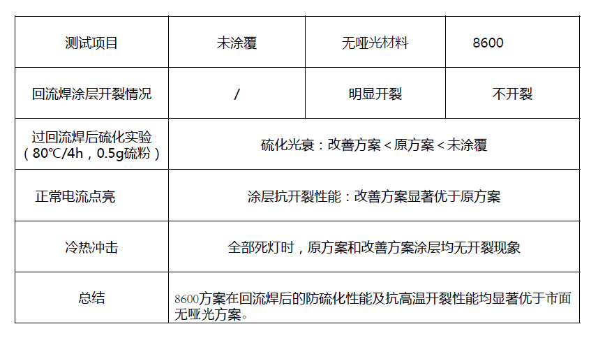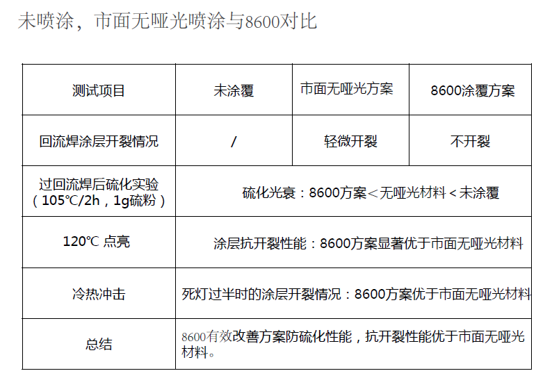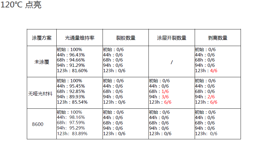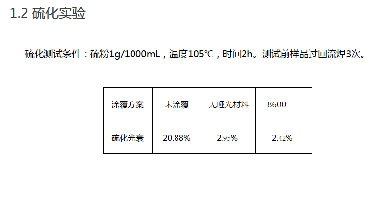 本方案之涂層,在有效提升RGB燈珠抗硫化能力的同時,亦解決產品一致性問題。本涂層硬度5-9H,防刮花,耐磨,全啞面(光澤度小于20),涂層厚度在5-15um時,透過率達93-95%.本產品為無機納米材料雜化樹脂,耐黃變,附著力優(yōu)異。采用壓電噴涂方式,熱固化(80-120度,30分鐘)即可進入下一道工藝。如需測試相關性能,建議在完全固化7天后進行測試。